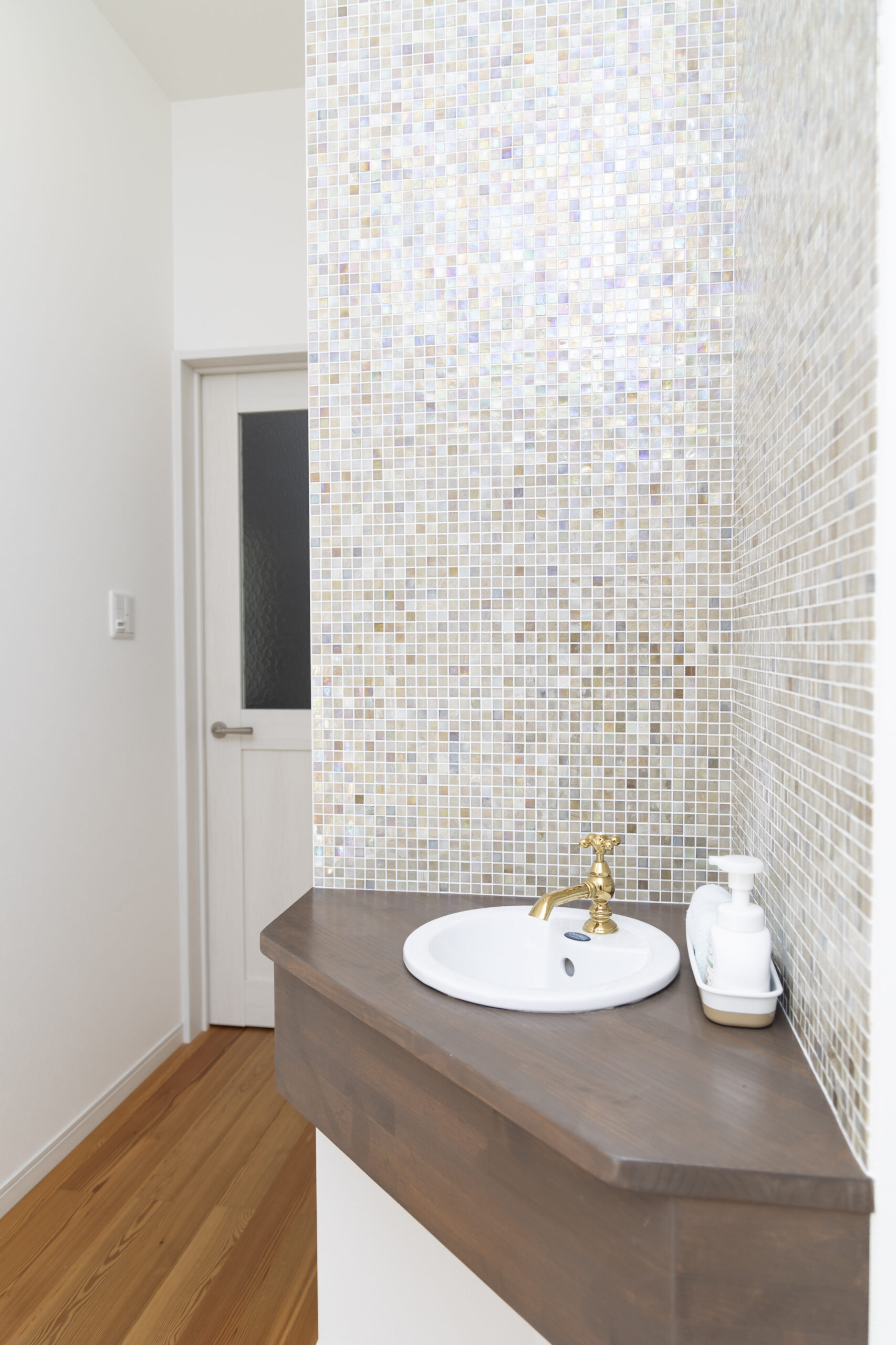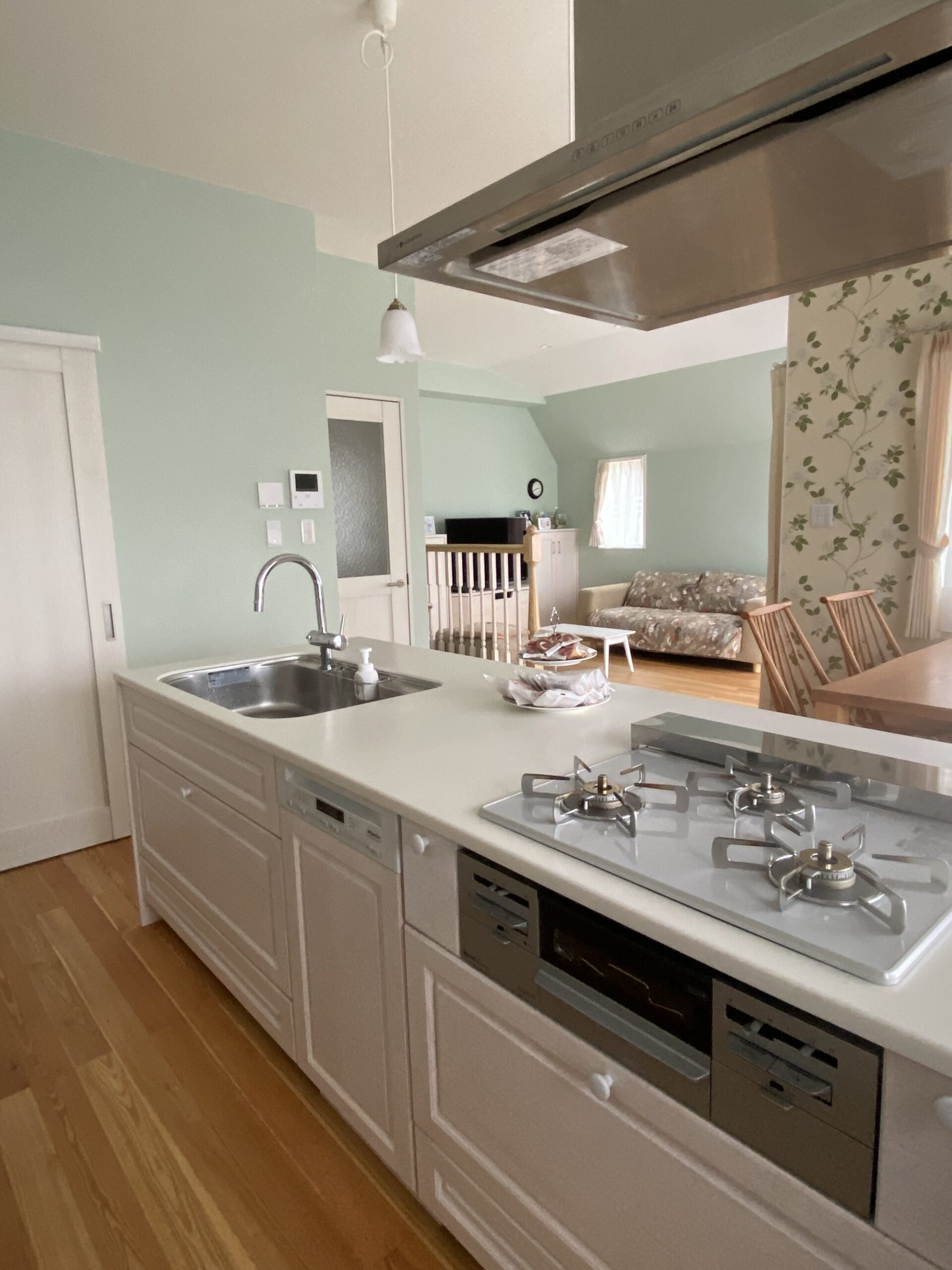 室内はモスグリーンを基調に、無垢の床や造作家具のやわらかな雰囲気に包まれた空間です。