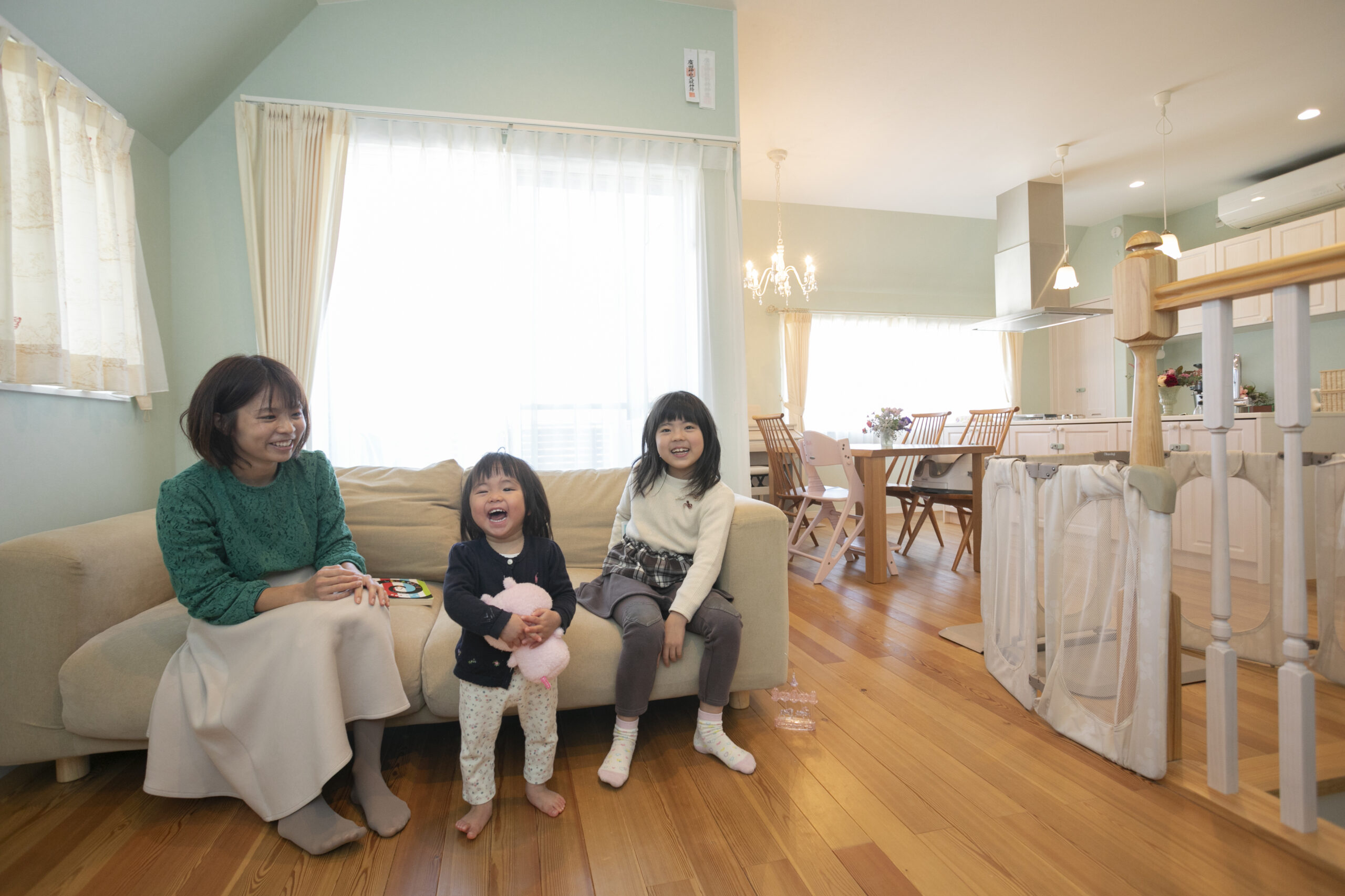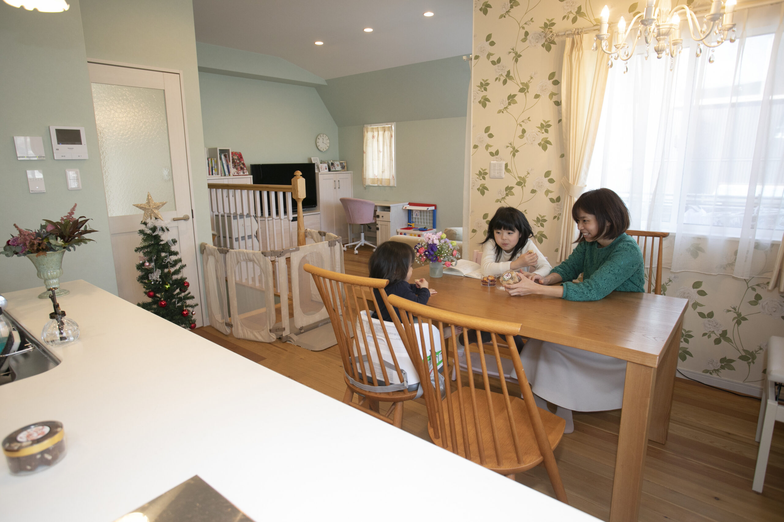 片側の視界が大きく開け、ご家族が集まるキッチンとダイニングには明るい光がたっぷり。