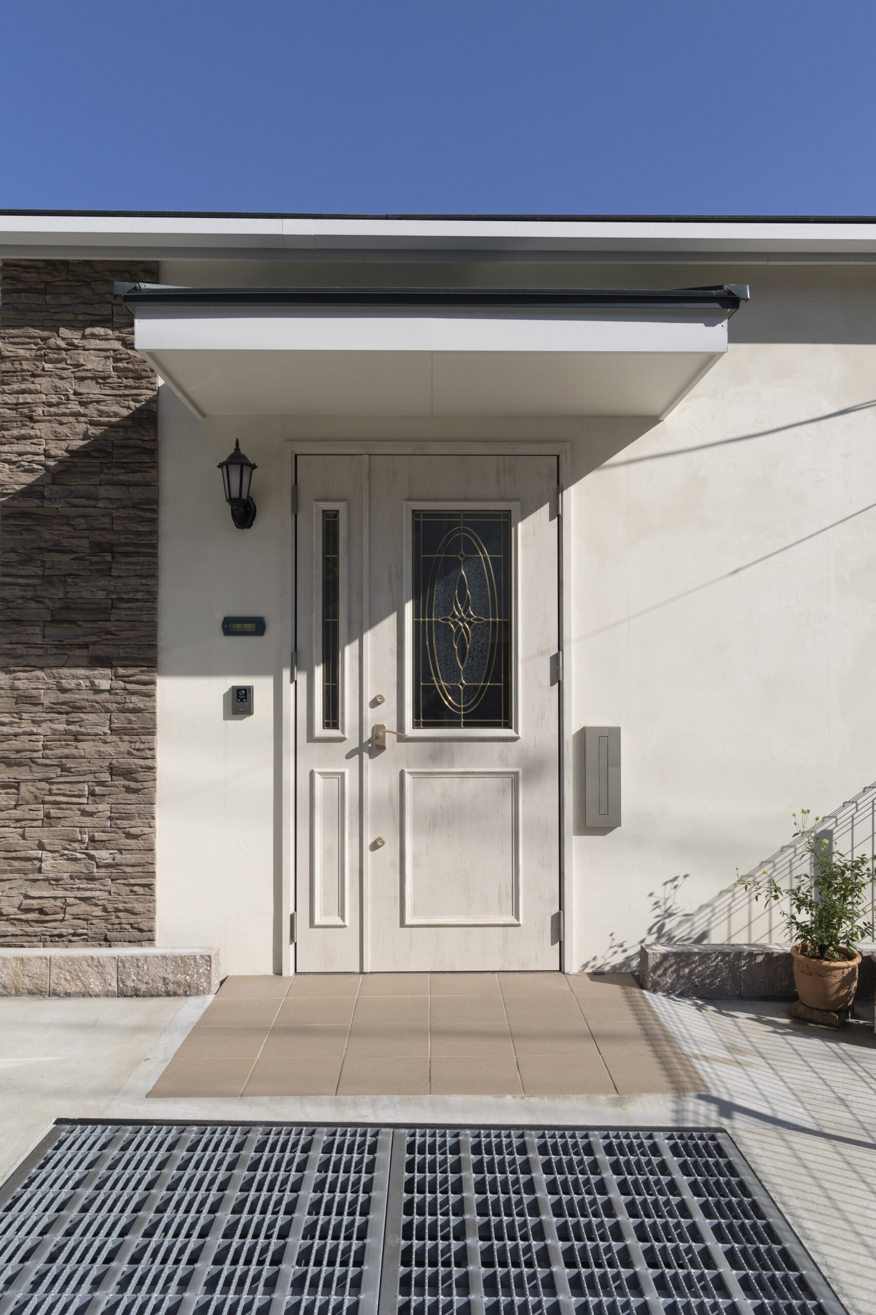 外からは平屋に見える落ち着いた外観に、石調タイルでさりげない上質感をプラス。
