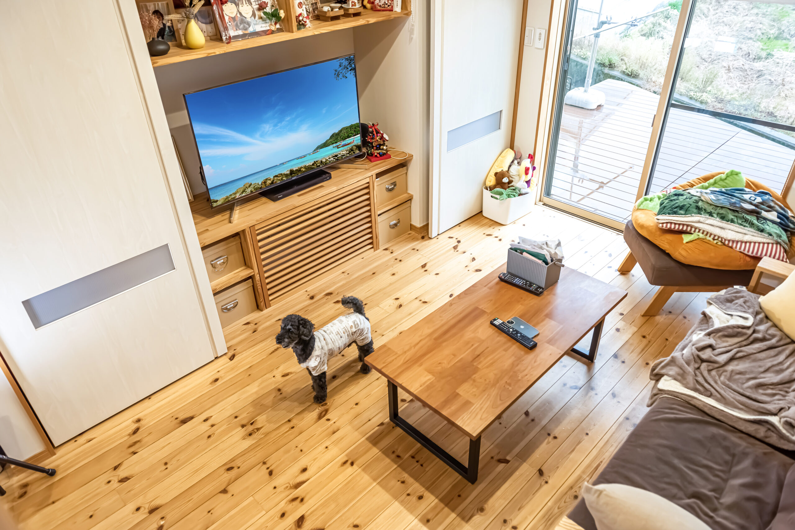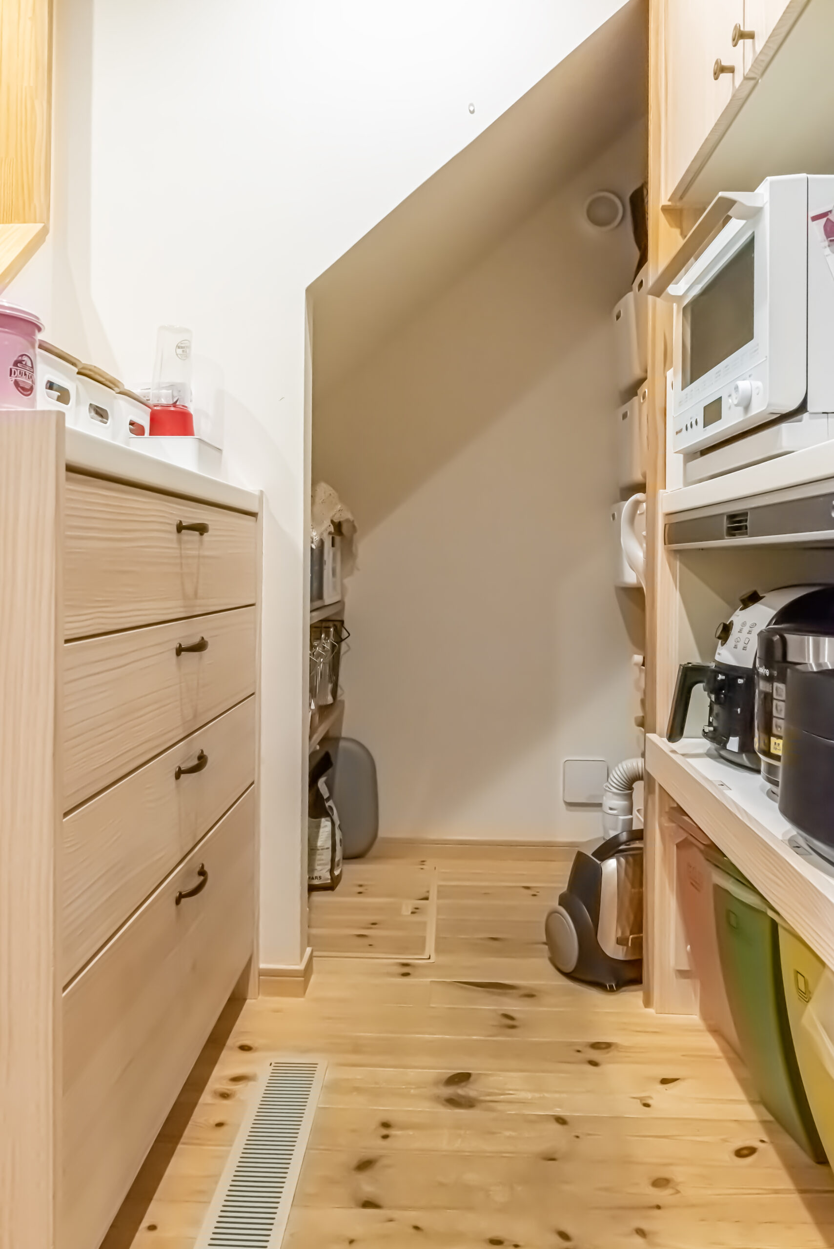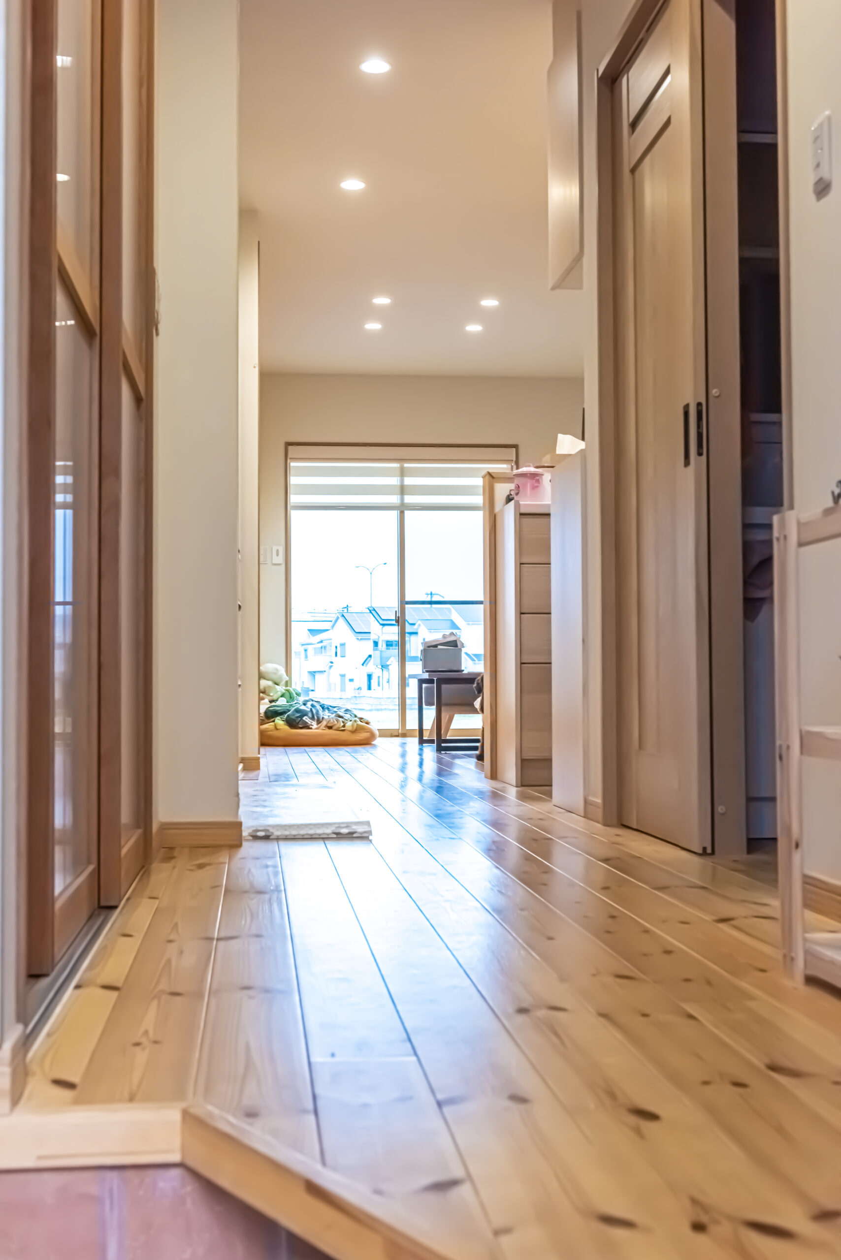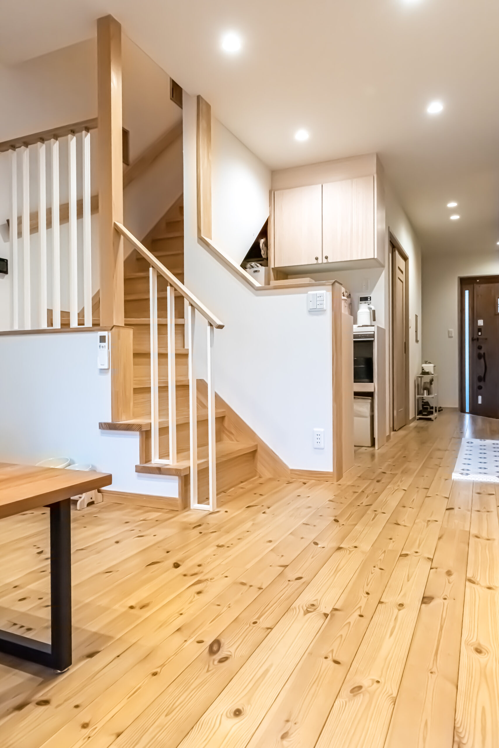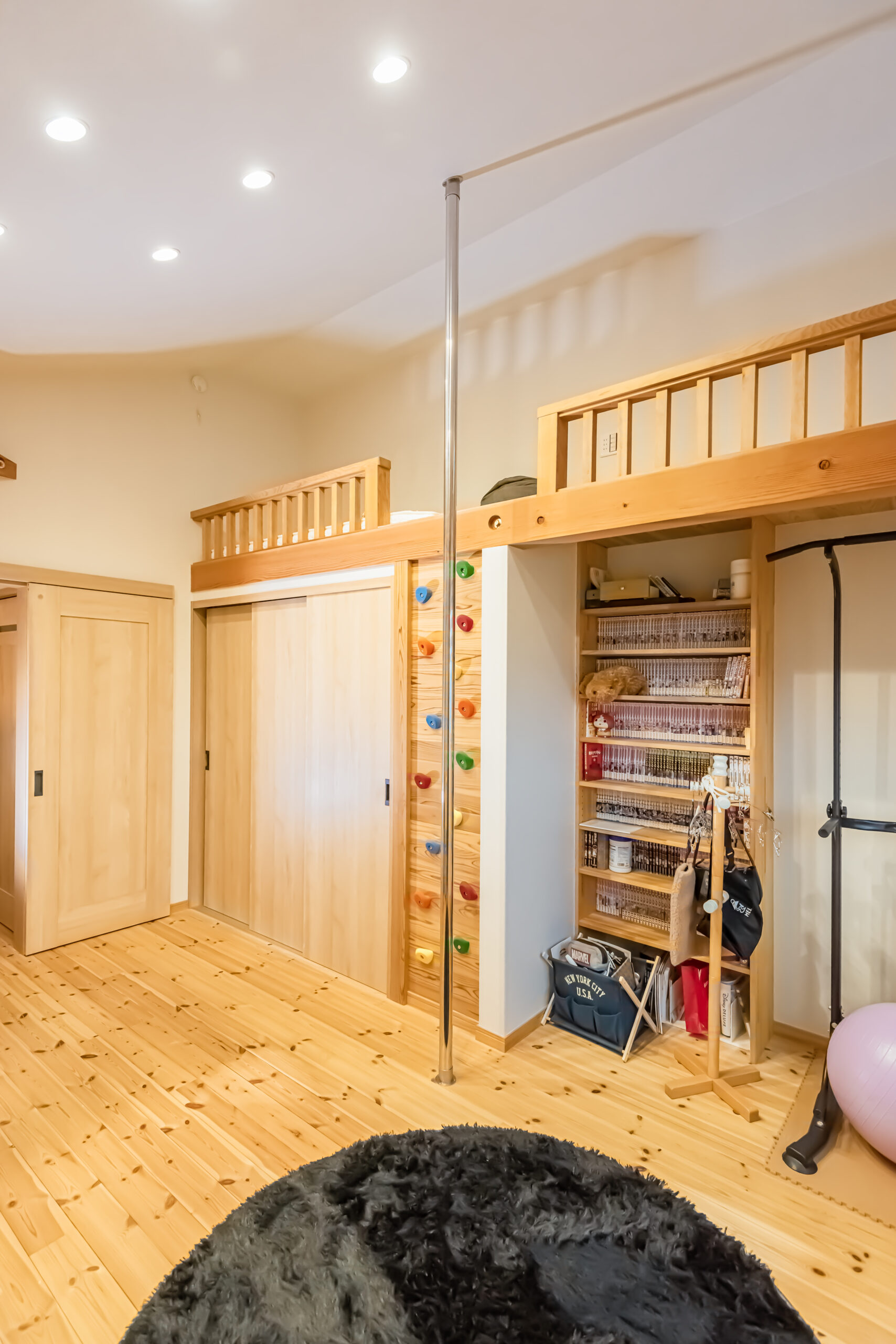 隣家が迫った狭⼩地でも、⾼度な設計⼒があれば、ゆったりとして明るい家が建てられます。奥に深い⻑⽅形の⼟地で、住空間にゆとりをも たらすのは⾄難の業だが、ありとあらゆる⼯夫を凝らしました。例えば、キッチン を動線としても活⽤したり、階段を折り曲げてその下をパントリーにしたり。リビングを⼀番奥に配置して明るさと開放感をもたらした。⽔まわり以外ほとんど間仕切りをとり、光も視線も細部まで届かせ開放感を創出。気密・断熱性が⾼く、床下を温かい空気が巡らせるシステムを導入。子ども部屋のロフトに上り下りできるポールやボルダリングの壁を設けました。